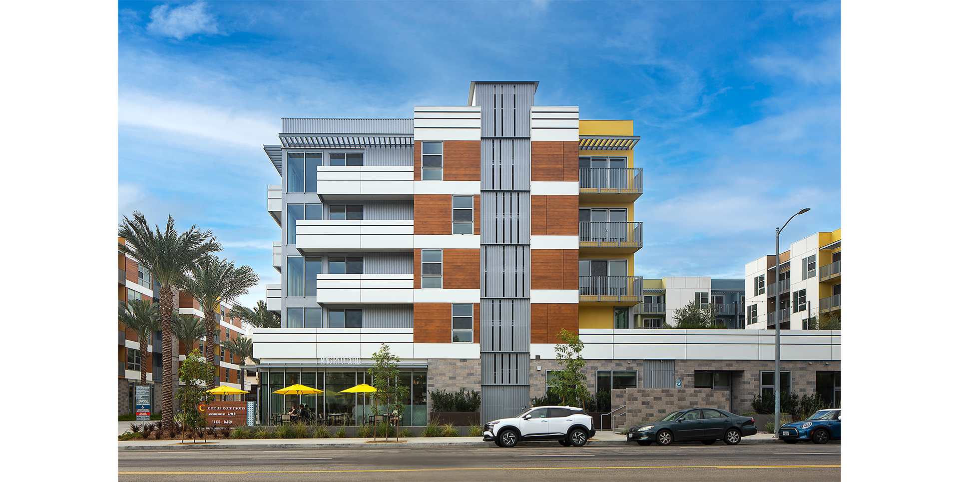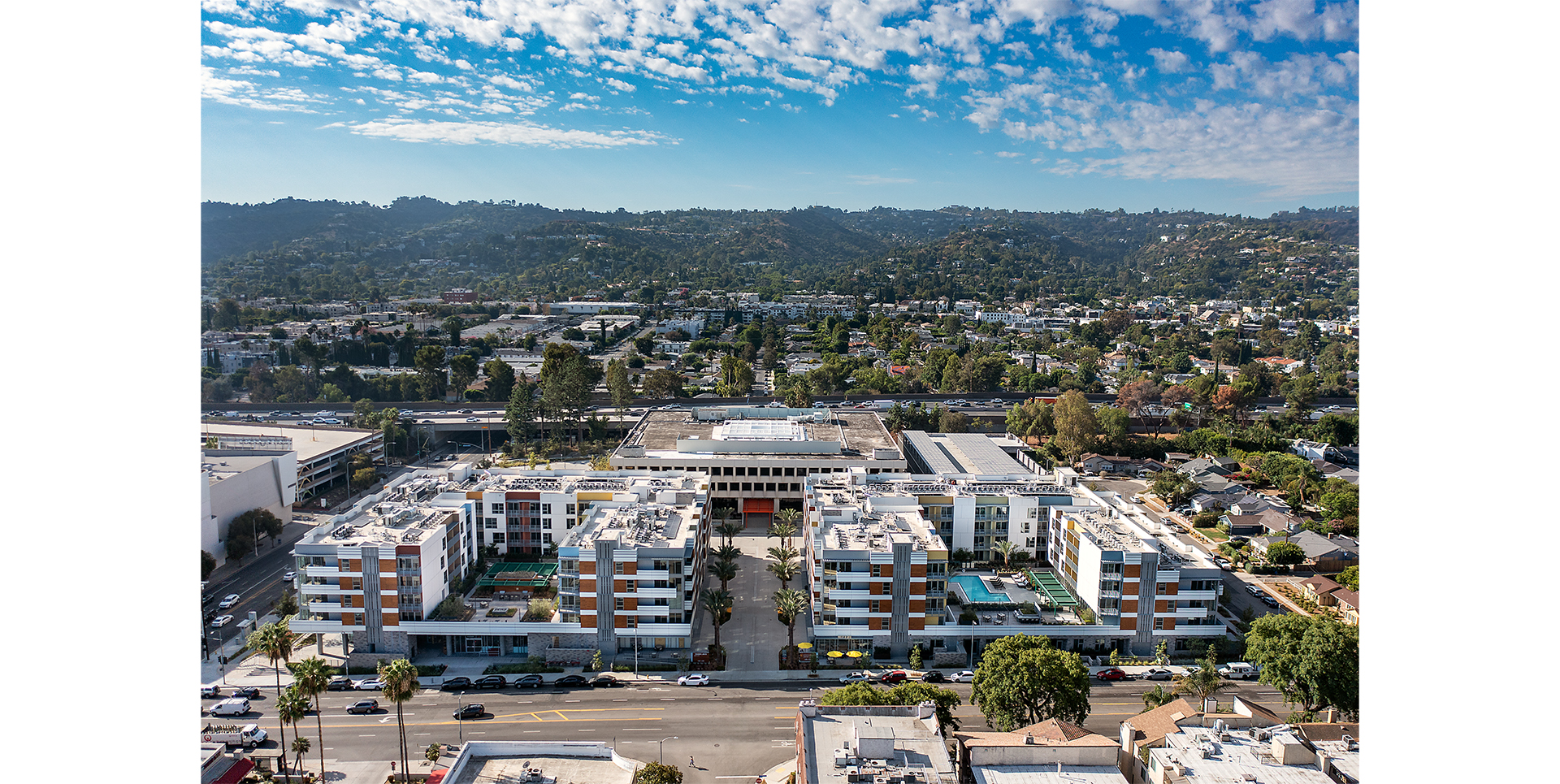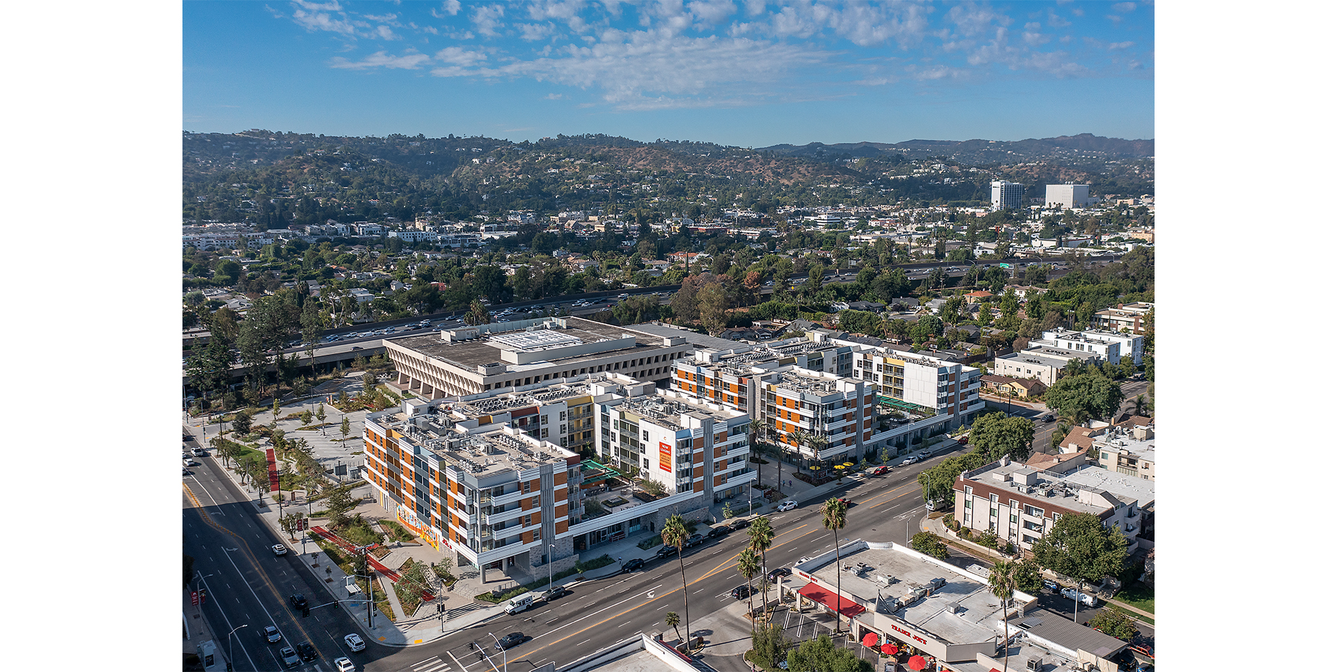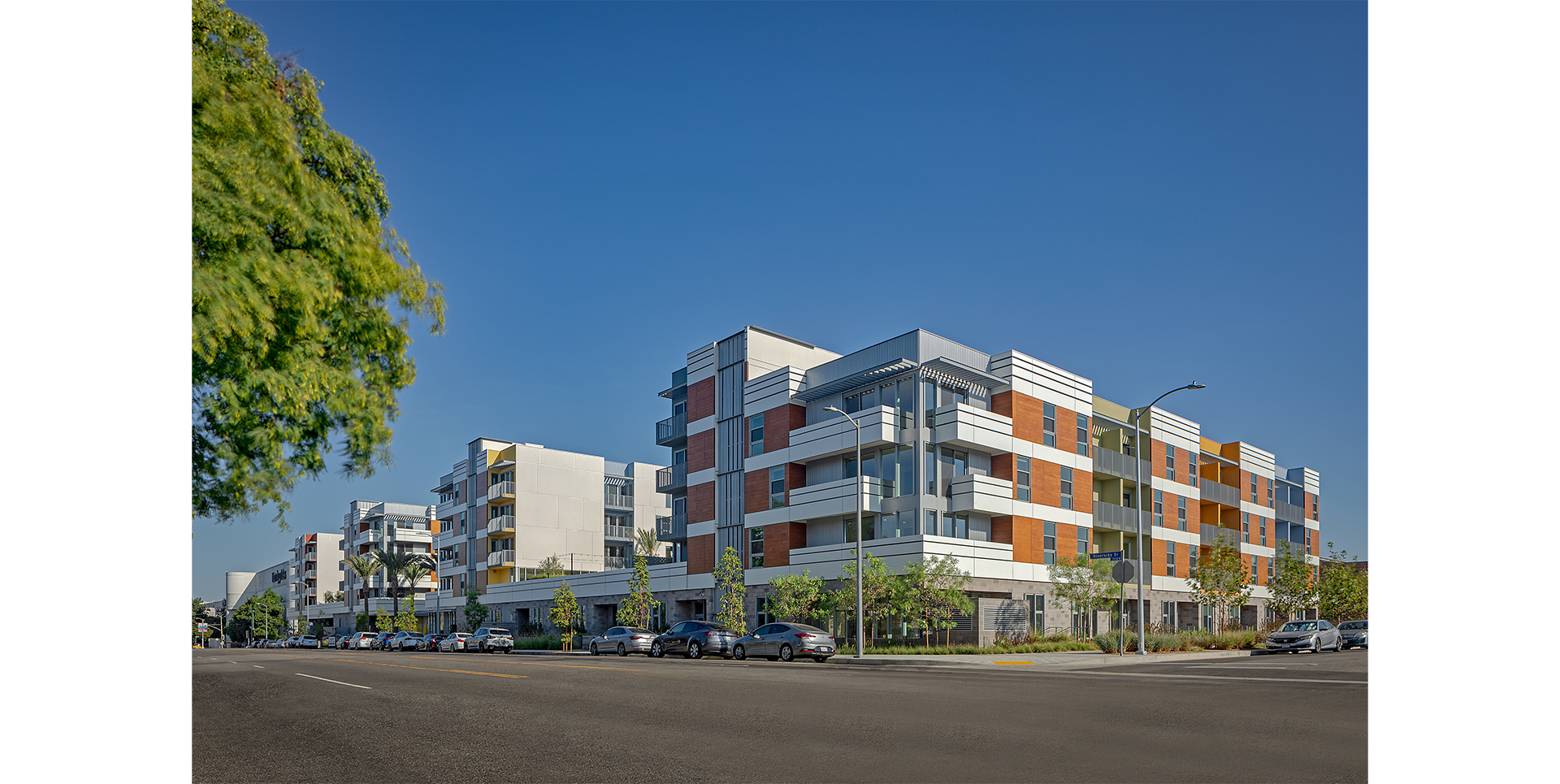 Two mixed-use residential buildings are located along Riverside Drive. A major grocer anchors the ground floor along with smaller community-serving retail tenants and the residential lobbies. The residences are a mix of one and two-bedroom units plus ground level townhouses. Parking is dispersed throughout the site in either below-grade levels or perimeter above-grade parking structures. Street trees and furnishings, paving and plant materials provide continuity and encourage public access through the project, the surrounding neighborhood and the landscaped parkway along the adjacent Los Angeles River.