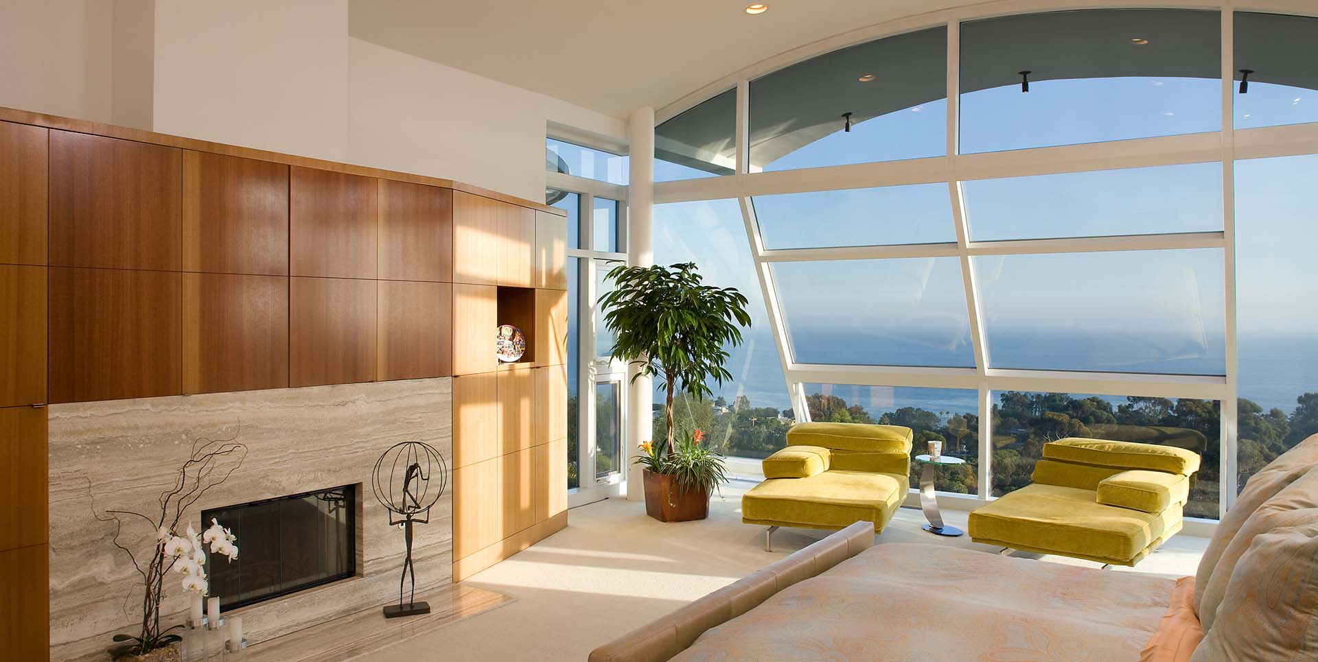 This hillside home was designed for a family of five and is located on a sloping site overlooking the Pacific Ocean. The 8,000 square foot structure is set into the hillside with motor court and primary entry on the top of two floors. A dramatic and skylit stair lines the interior of a fully glazed and cylindrical two-story living room. All primary rooms are fully glazed to the west giving them ocean views and maximizing sunlight and fresh air.